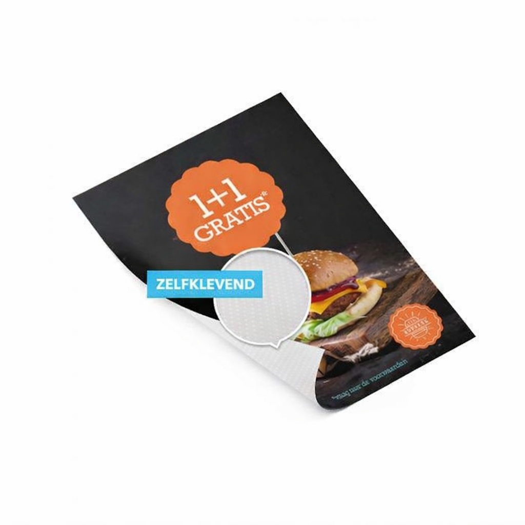 Zelfklevende Poster is een printposter met een zelfklevende achterkant die eenvoudig op vlakke ondergronden geplakt kan worden zonder extra bevestigingsmateriaal. De full-color print zorgt voor een scherpe en levendige weergave van jouw ontwerp, waardoor deze poster perfect geschikt is voor promoties, muurdecoratie, winkelcommunicatie of tijdelijke campagnes. Het materiaal laat zich makkelijk verwijderen zonder residu achter te laten.